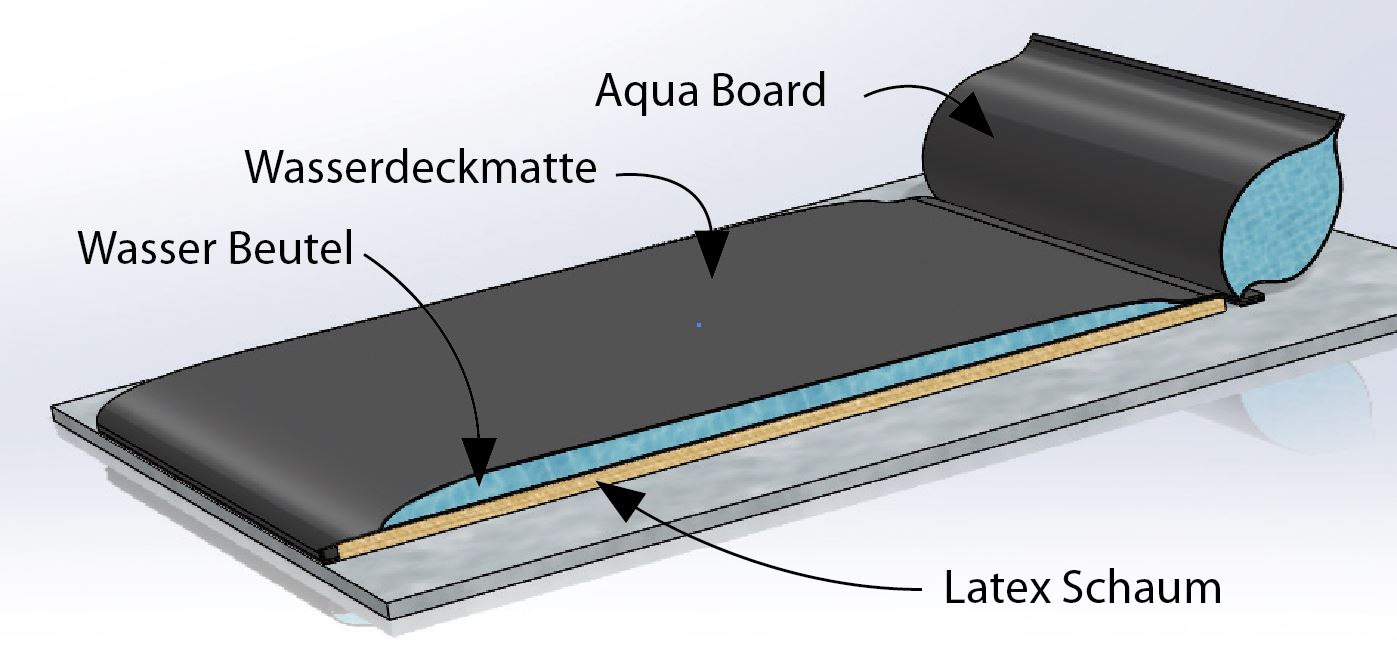 Dicke: 40 mm Wassertasche + 35 mm Latexmatratze = 75 mm insgesamt